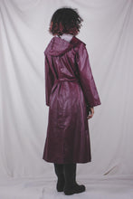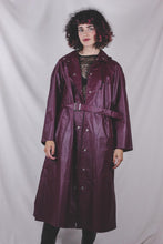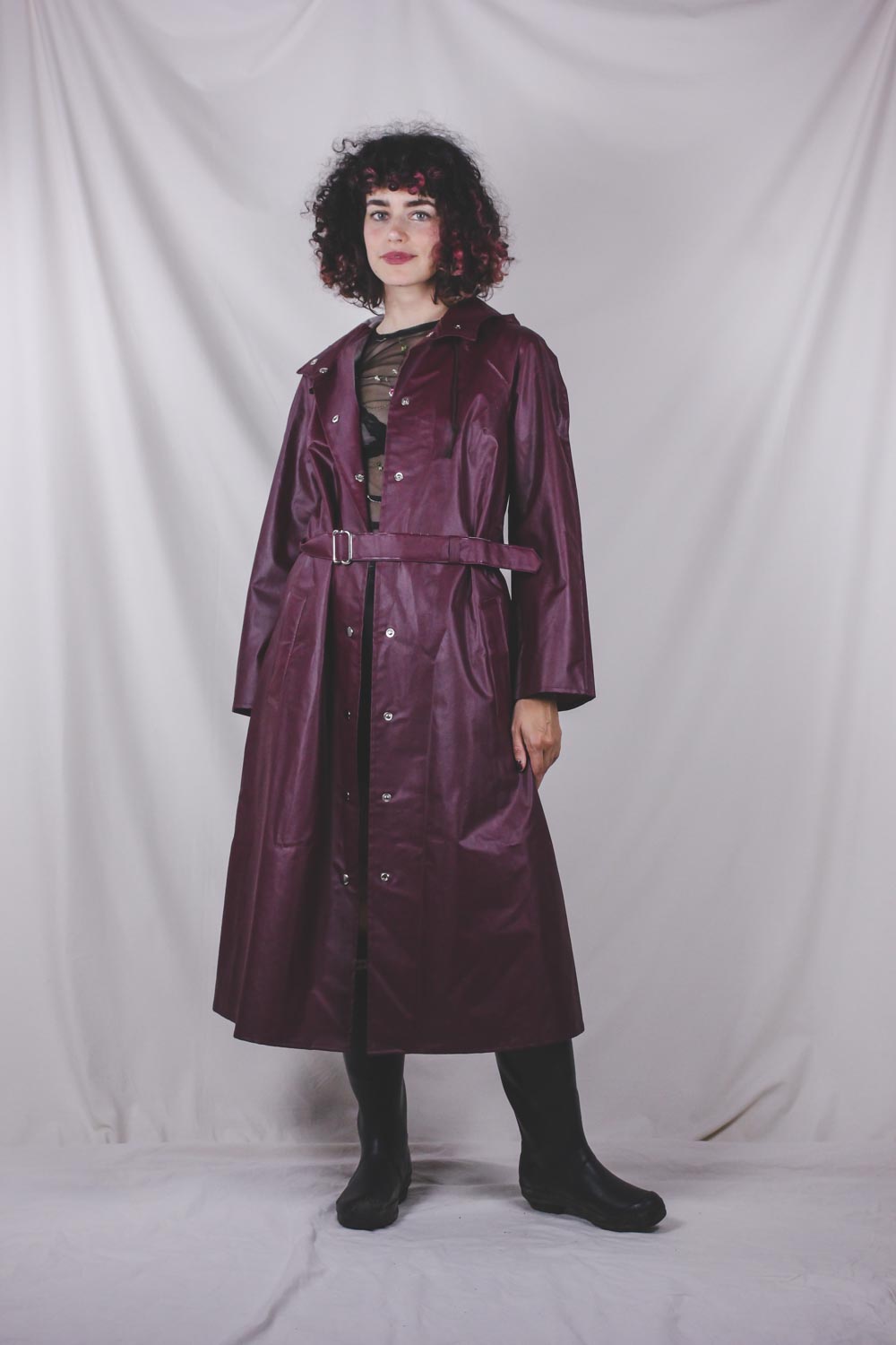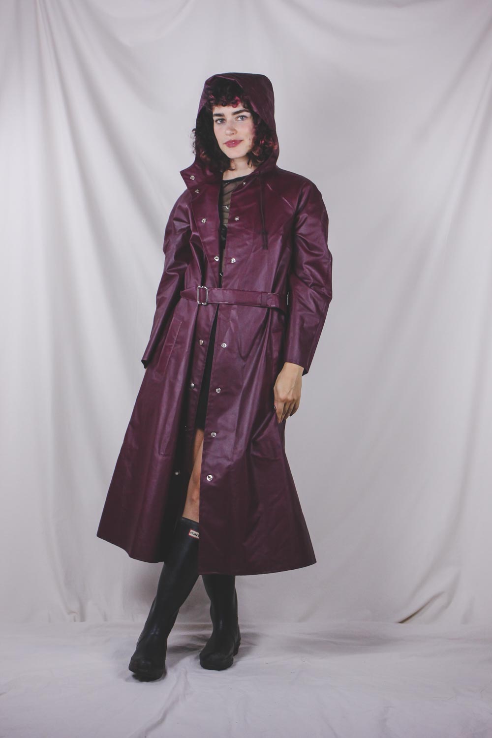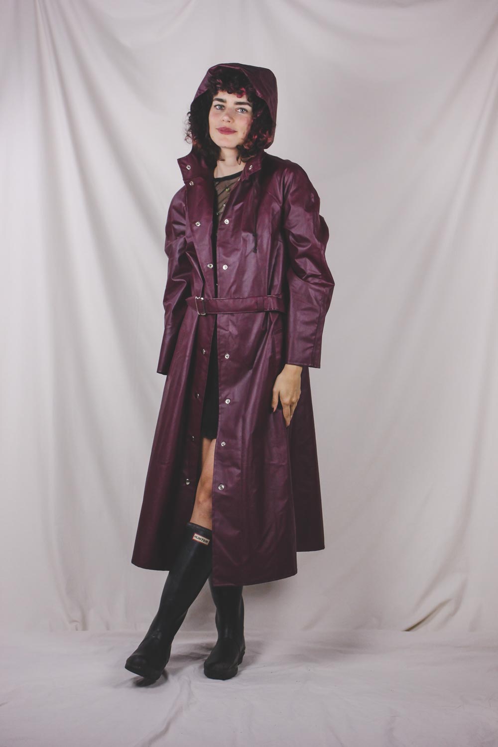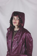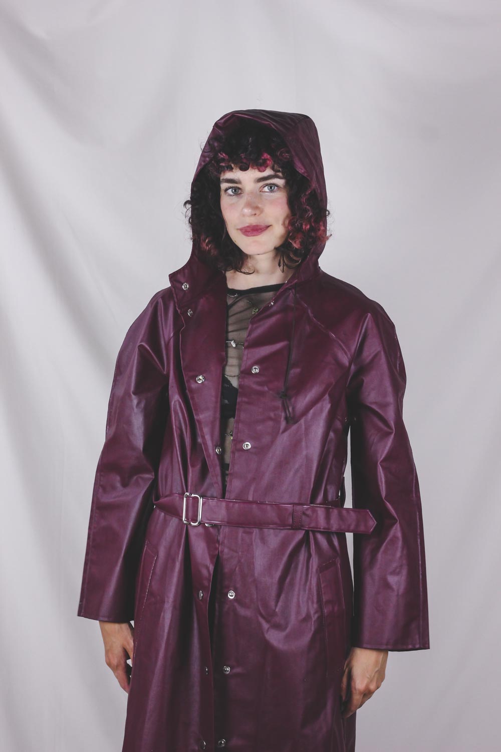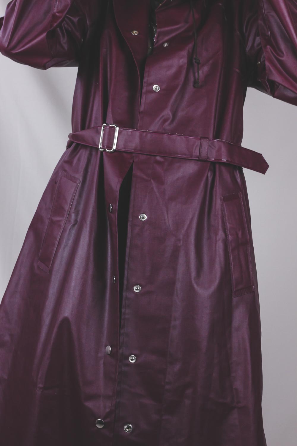 Upea luumunpunainen 60-luvulta peräisin oleva kotimainen vintagesadetakki. Takki on aivan upeassa kunnossa! Takissa on huppu sekä näyttävä vyösolki. Vuoreton.