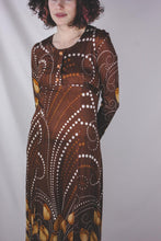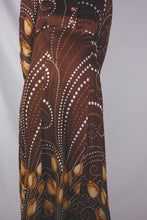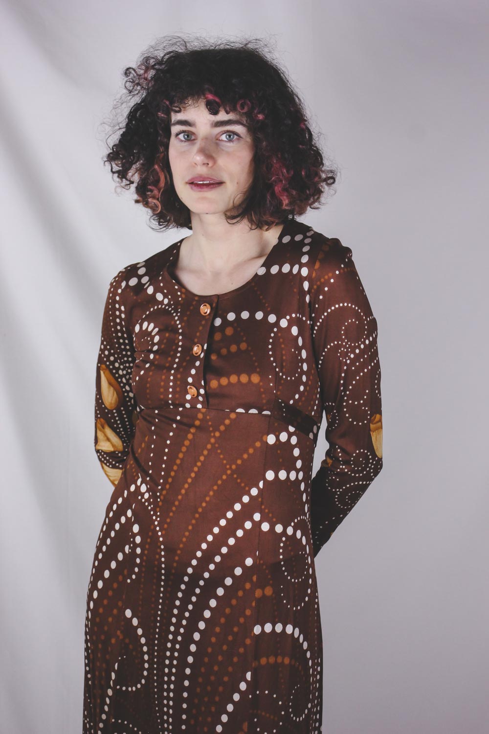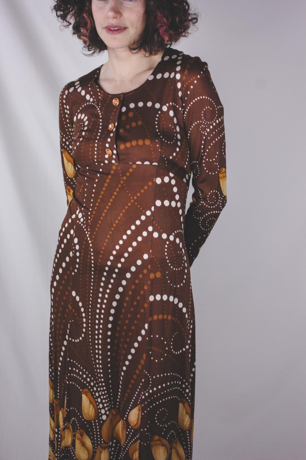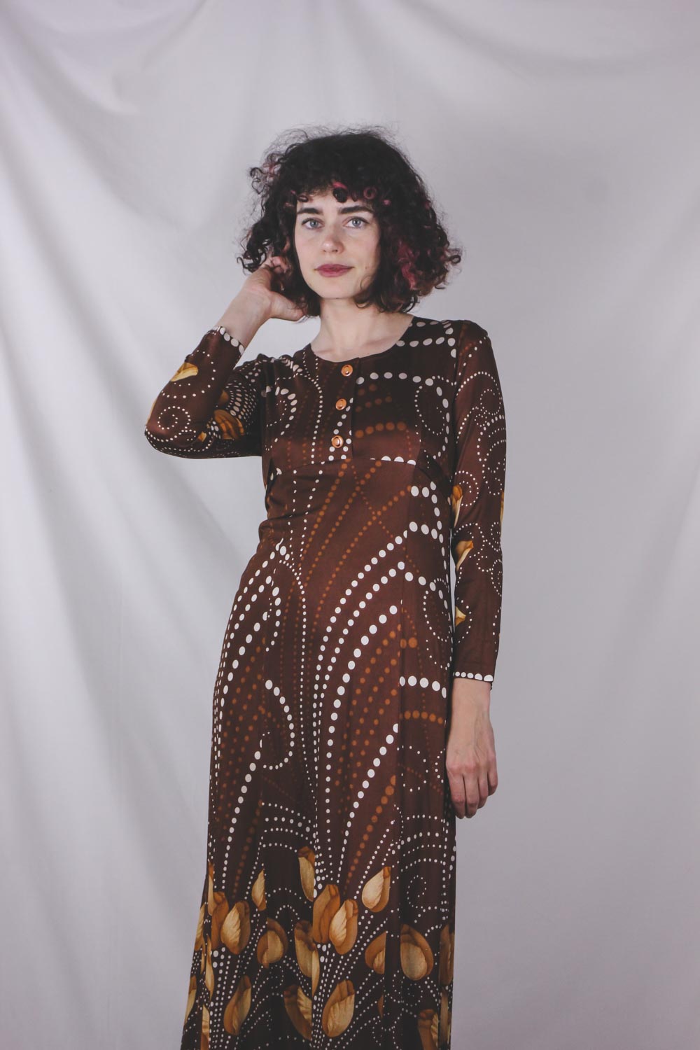 Mielettömän upea 70-luvun maksimekko! Ihanan kevyttä hieman viskoosia muistuttavaa synteettistä materiaalia. Vuoreton. Käyttäjän pituudesta riippuen joko midi tai maksi.