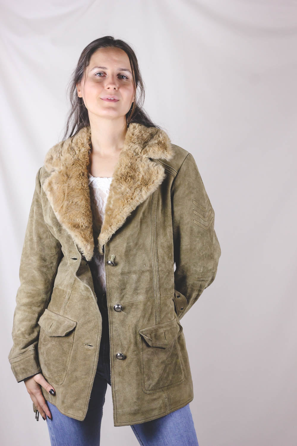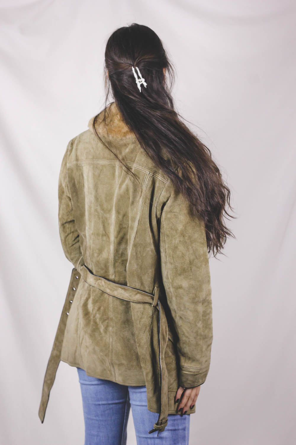 Kunto: Hyvässä vintagekunnossa (mokkanahka kulunut ja tummunut paikoittain. Taskujen alkuperäiset napit puuttuu, korvattu uusilla)