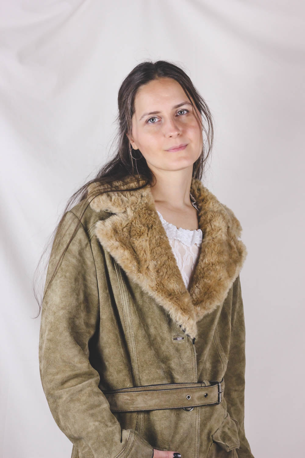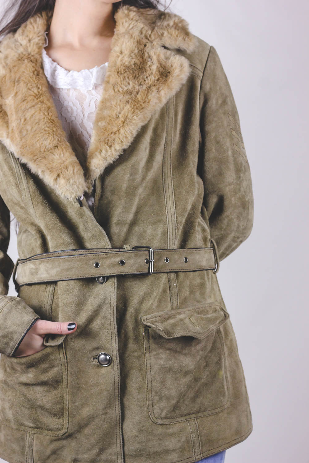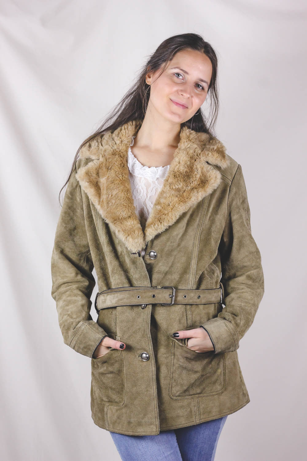 Kaunis vyöllinen lampaannahkatakki. Aito lampaankarvakaulus. Takissa kevyt vuori.
