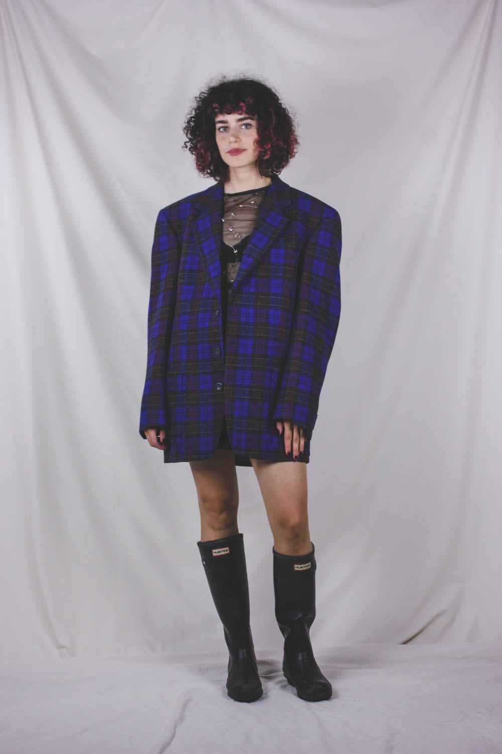 Mielettömän kaunis violetinsävyinen vintageruutubleiseri 80-luvulta! Super skarpissa kunnossa! Kevyet olkatuet. Kultainen viskoosivuori. Sopii over-size mallisena myös S-L kokoiselle.