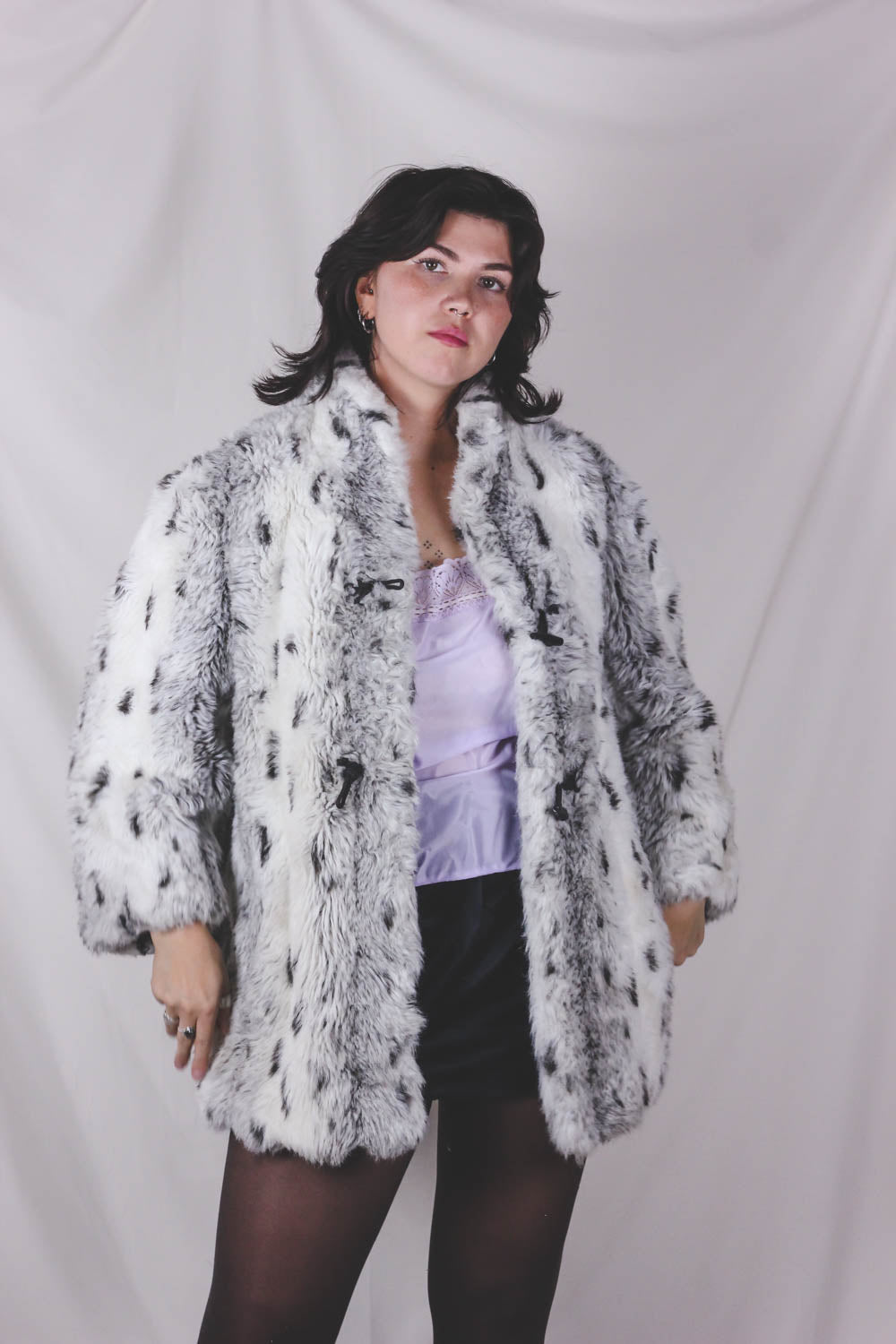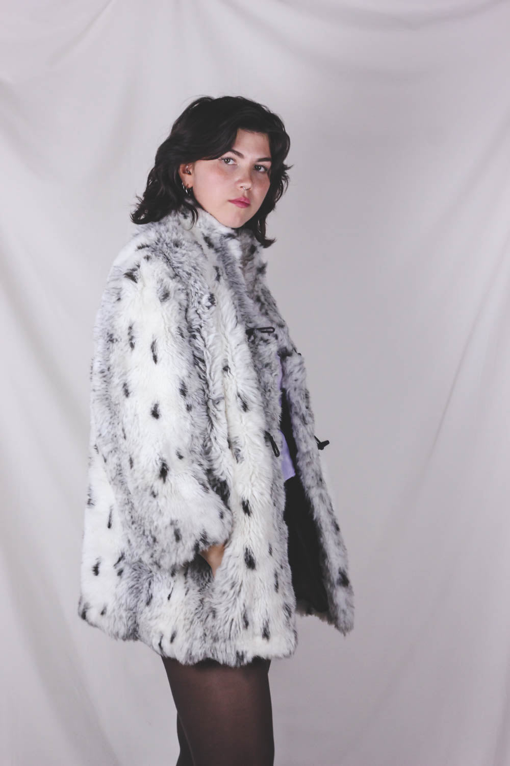 Aivan älyttömän söpö dalmatialaiskeinokarvatakki! Suljetaan hakasilla. Takissa taskut. Kevyt ja lämmin. <3