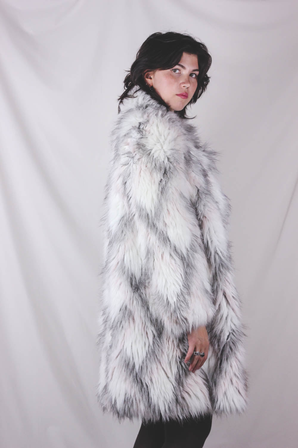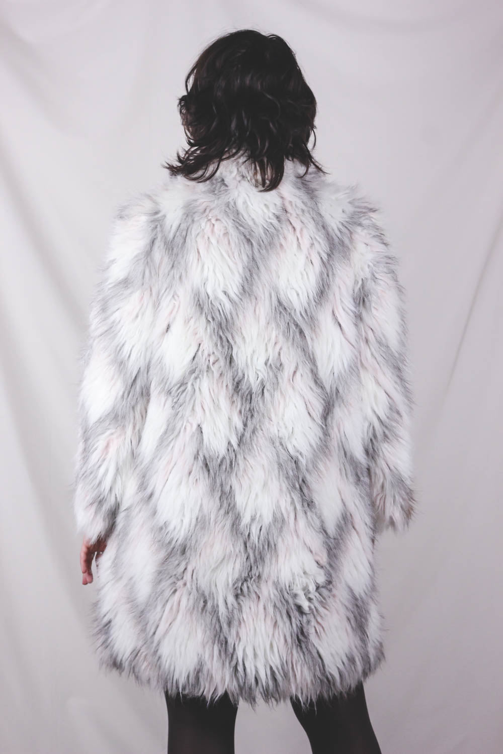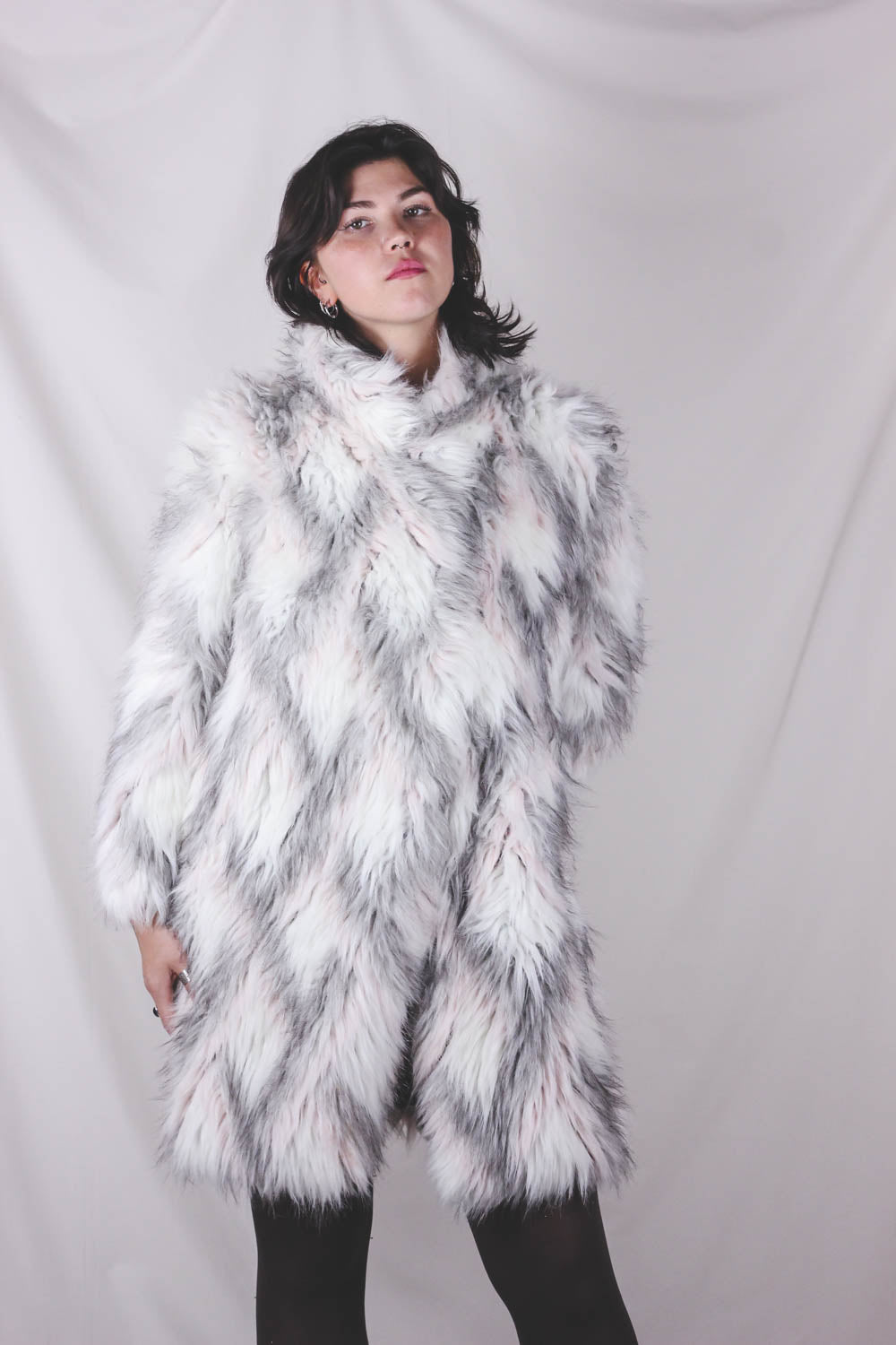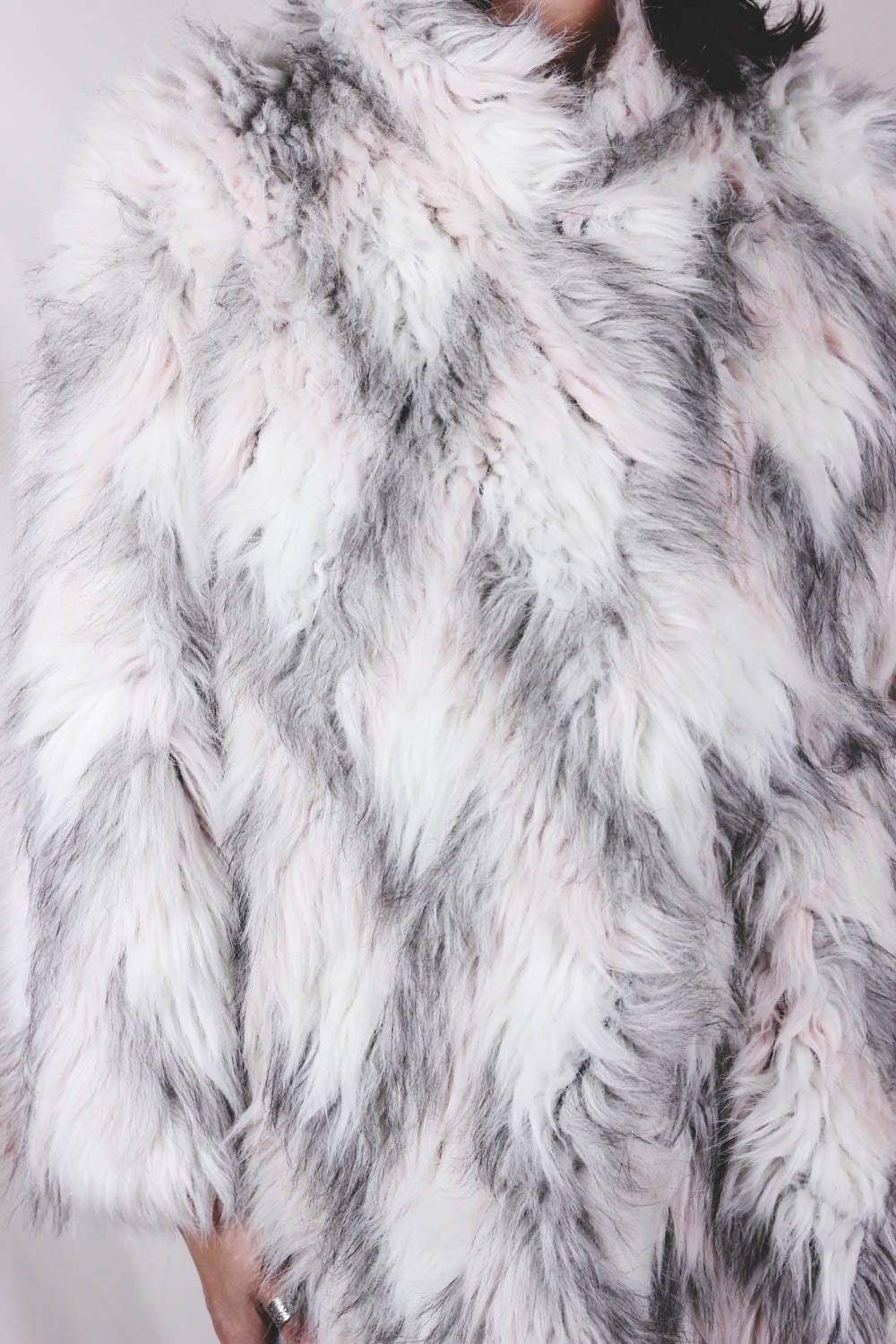 Aivan älyttömän kaunis pitkäkarvainen keinoturkis, jossa valkoinen pohja sekä harmaata ja vaaleanpunaista kuviointia! Takki on kevyt. Suljetaan hakasilla. Takissa on taskut. Takki on vastapesty ja harjattu. Mikäli tulevaisuudessa takille on pesun tarve, kannattaa se harjata kevyesti kuivumisen jälkeen.