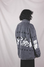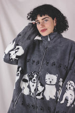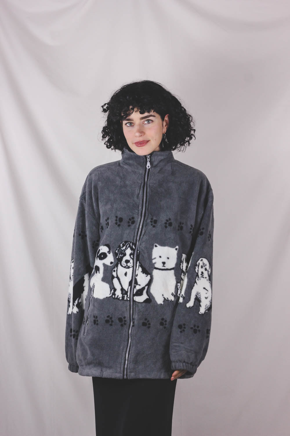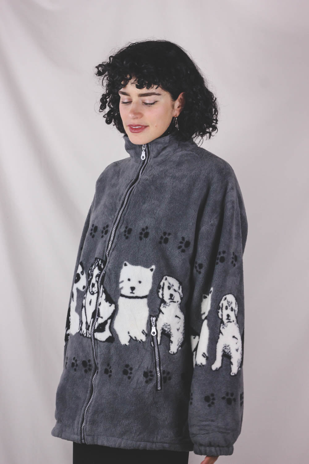 Super söpö harmaa koira-aiheinen 90-luvun fleecetakki! Takissa fleecevuori.