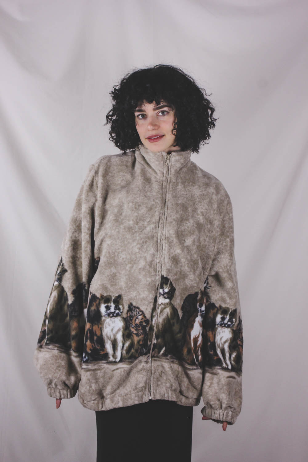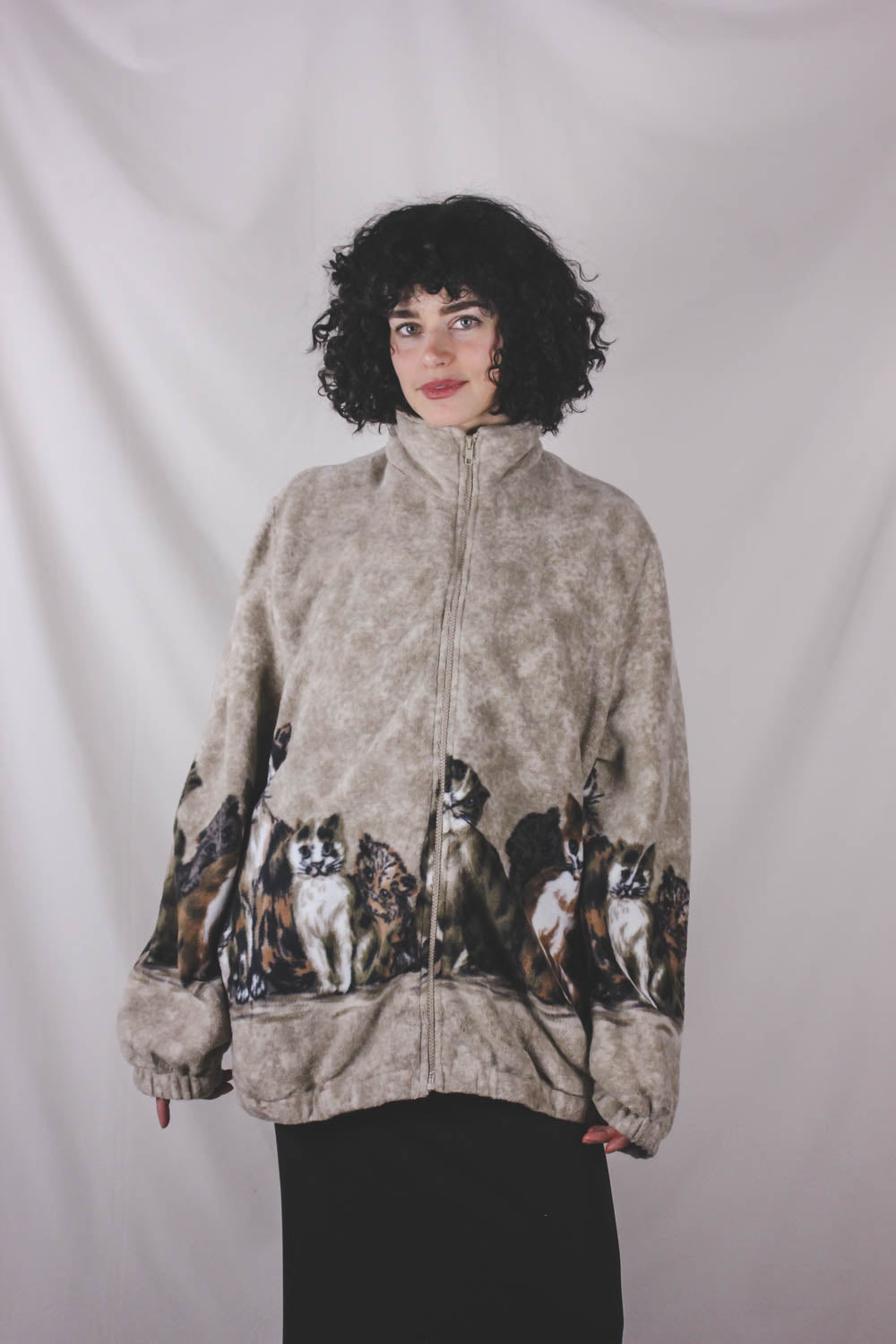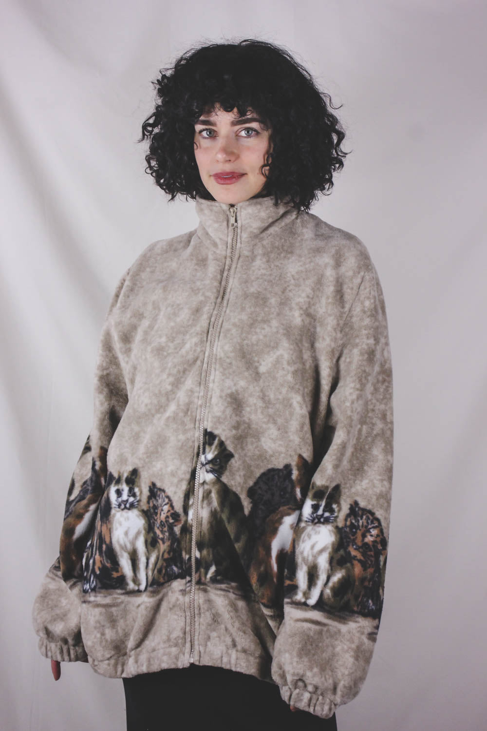Super söpö kissa-aiheinen vintagefleecetakki! Helmassa ja hihoissa kuminauhat.