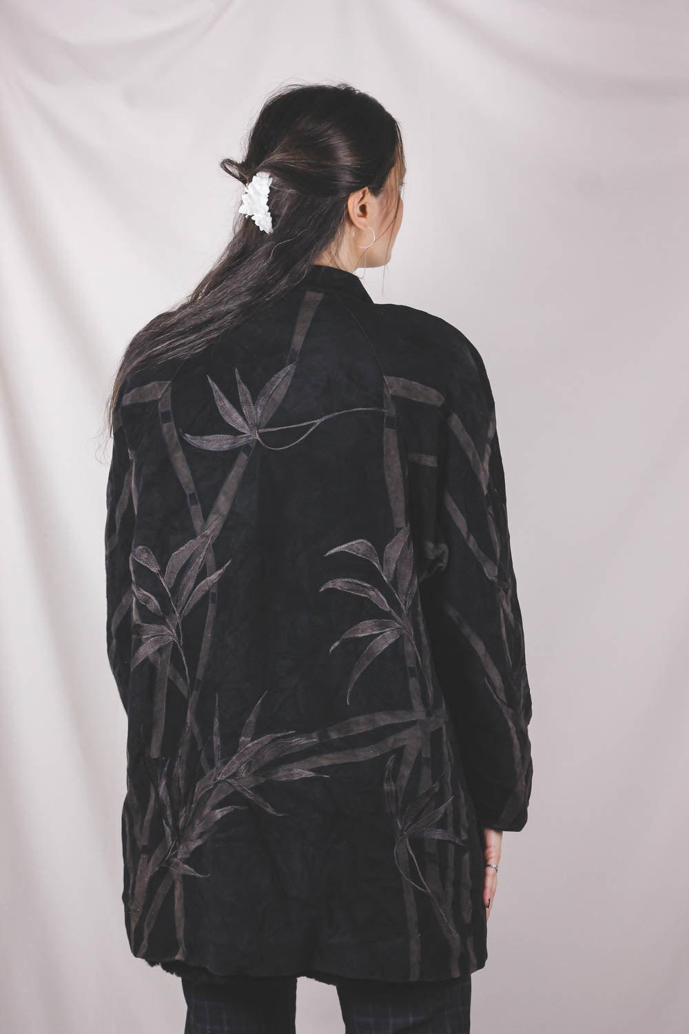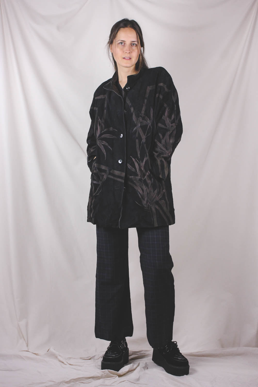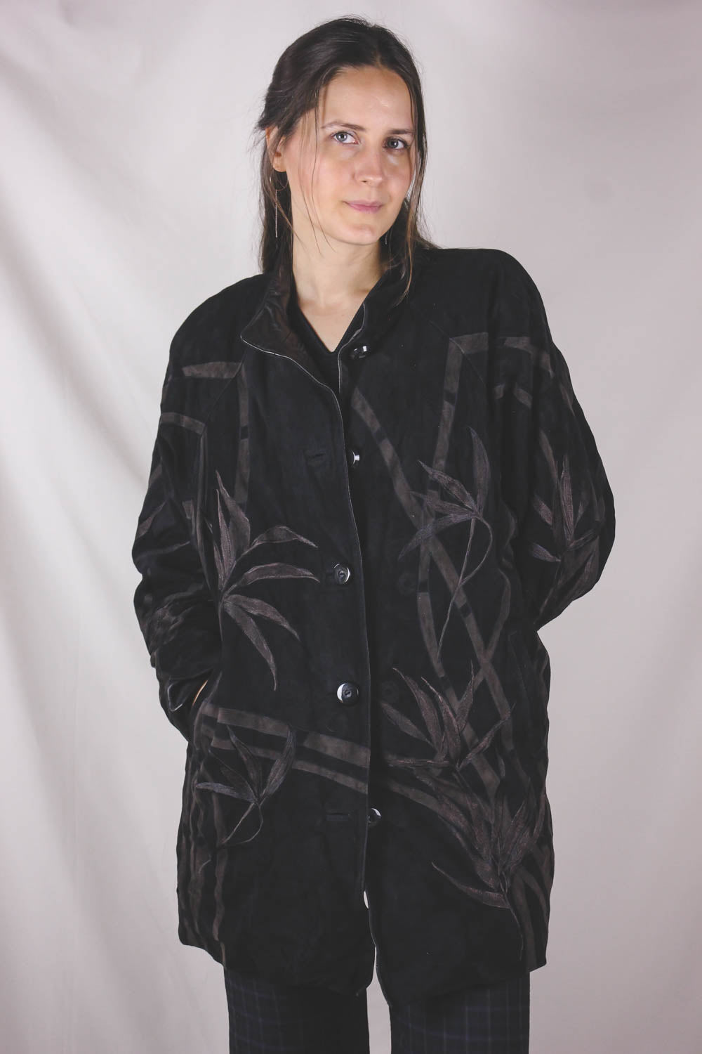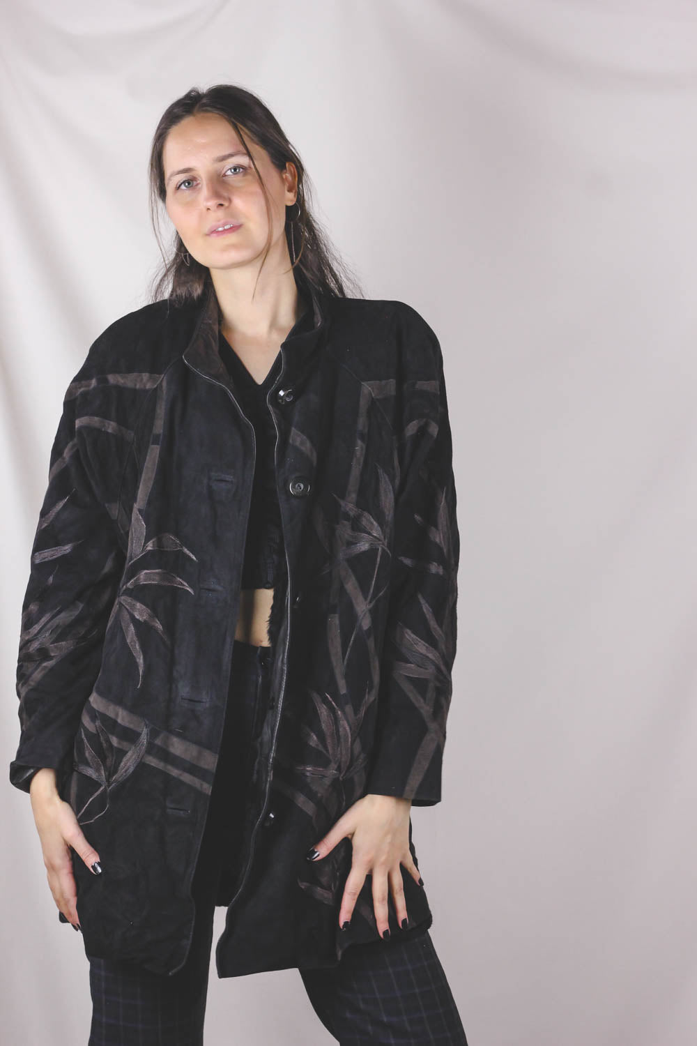 Upea musta kuvioitu mokkanahkatakki. Takki suljetaan napein. <3
