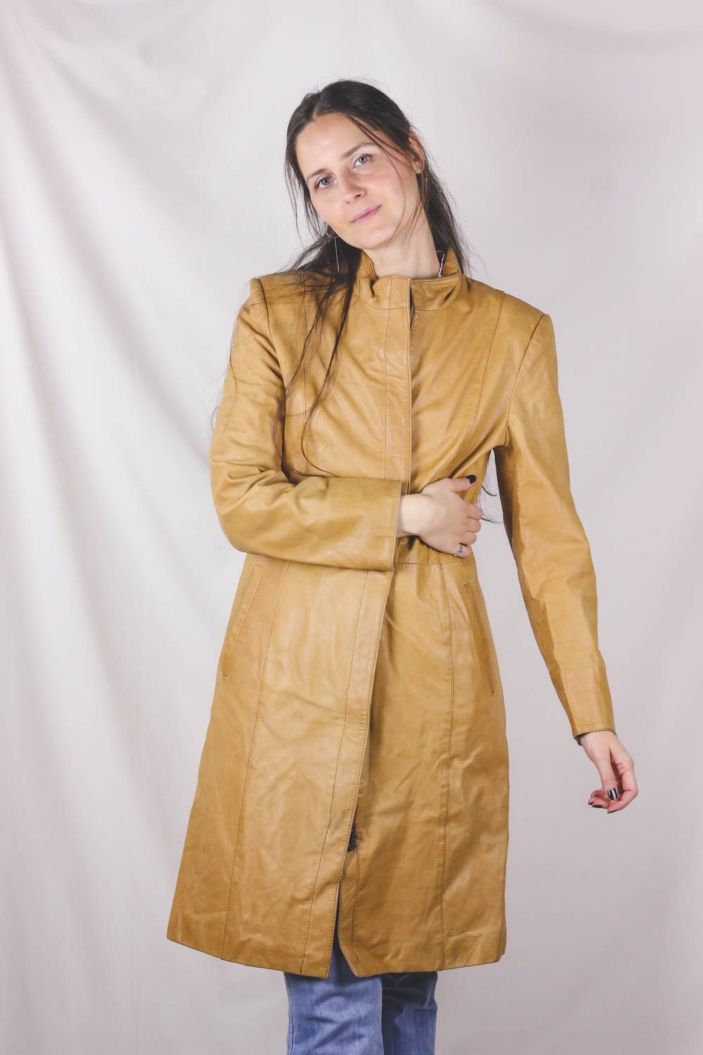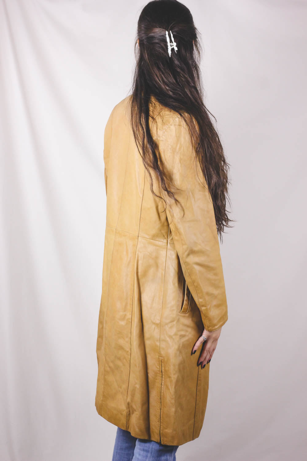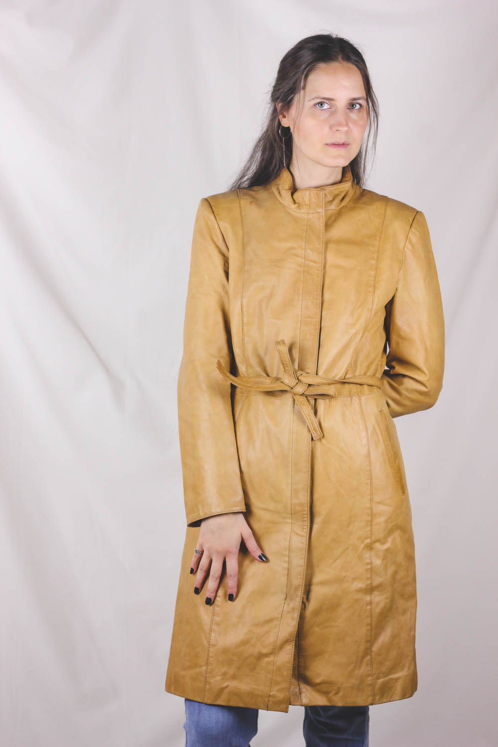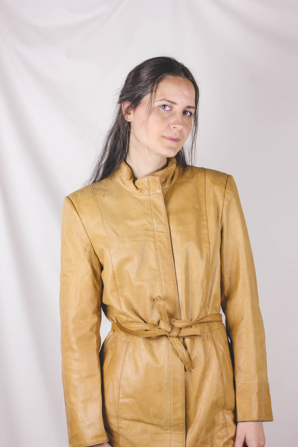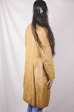 Upea vaaleankeltainen 70-luvun pitkä nahkatakki vyöllä. Kevyt.