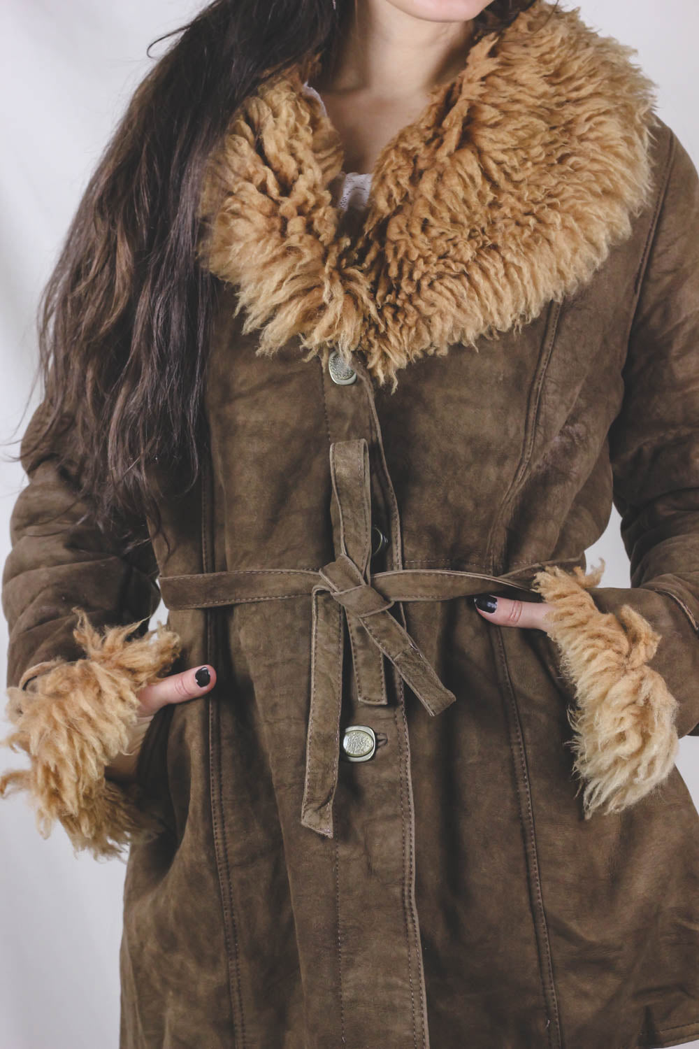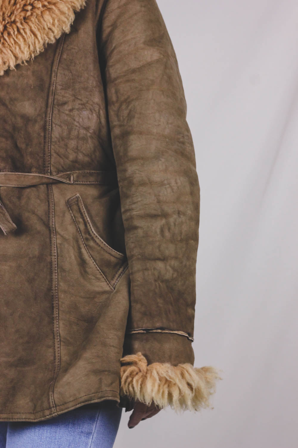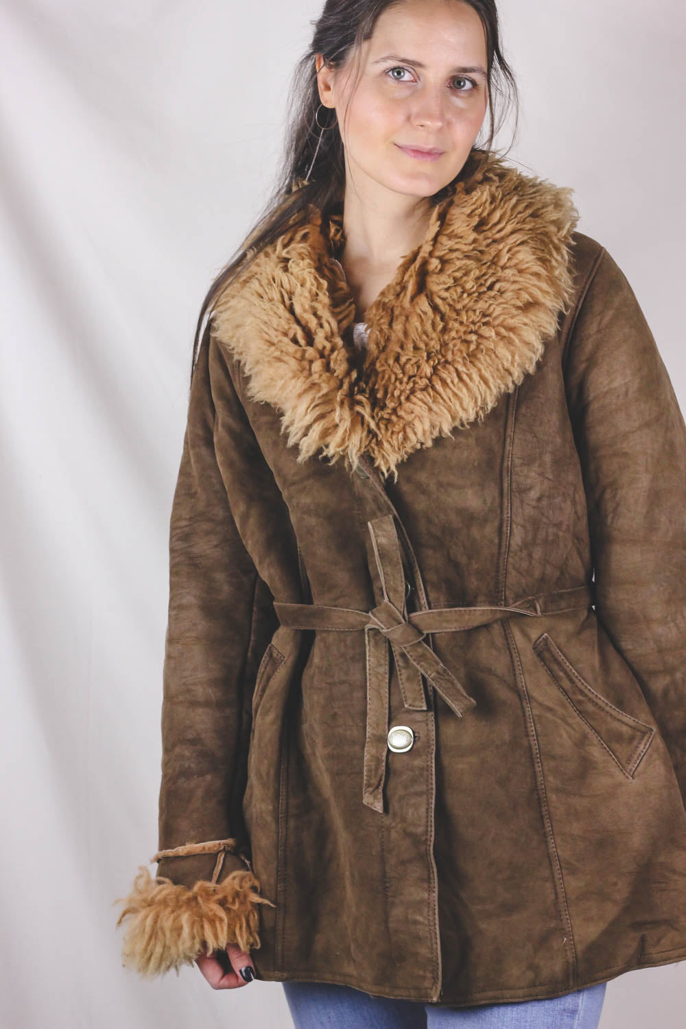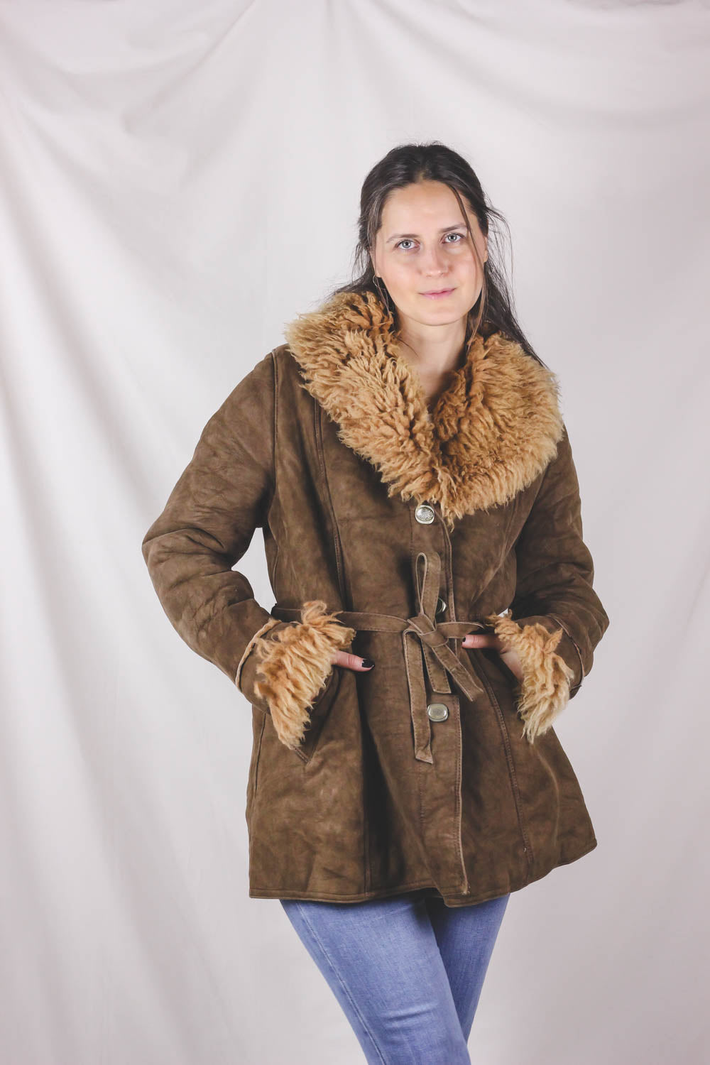 Aivan ihana vaaleanruskea lampaannahkatakki, jossa oranssihtava lampaankarva. Takissa lämmin lampaankarvavuori. Hihojen karvareunus jäi kuvissa piiloon, hihat ovat käännettävissä jolloin hihan karvaosuuden pituus on 11-12 cm.