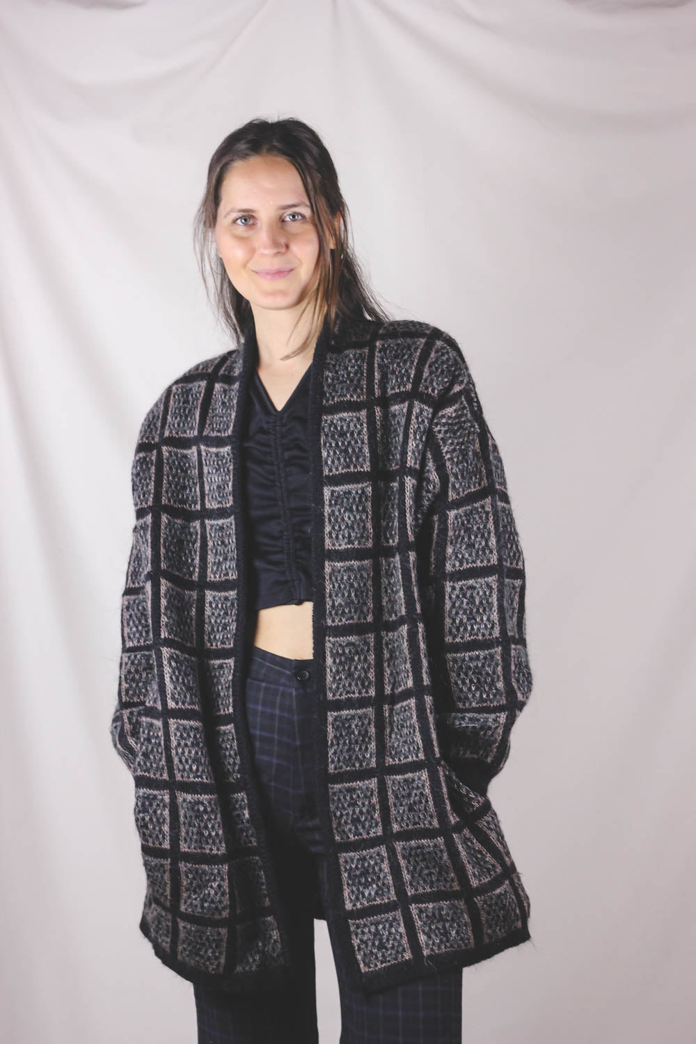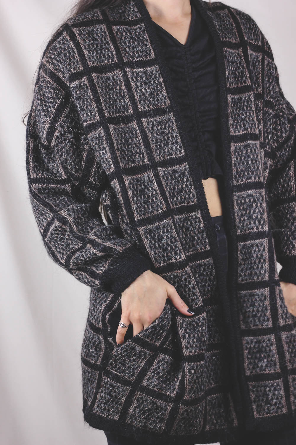 Kaunis avonainen taskullinen ruutukuvioitu mohairsekoiteneule. <3