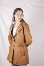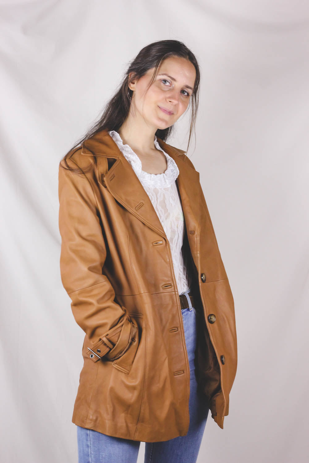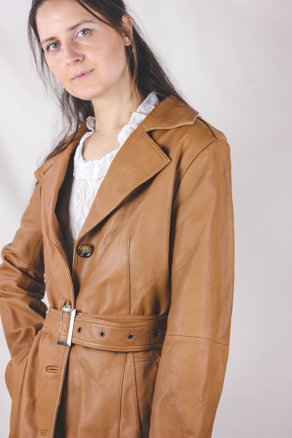 Kaunis kamelinruskea nappanahkatakki (erityisen pehmeää nahkaa) vyöllä. <3