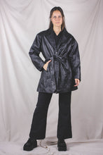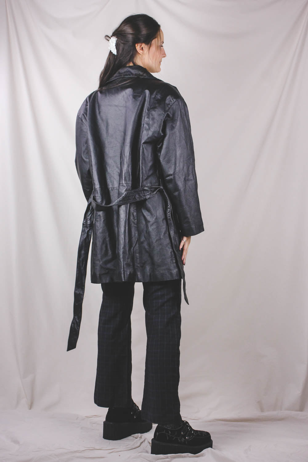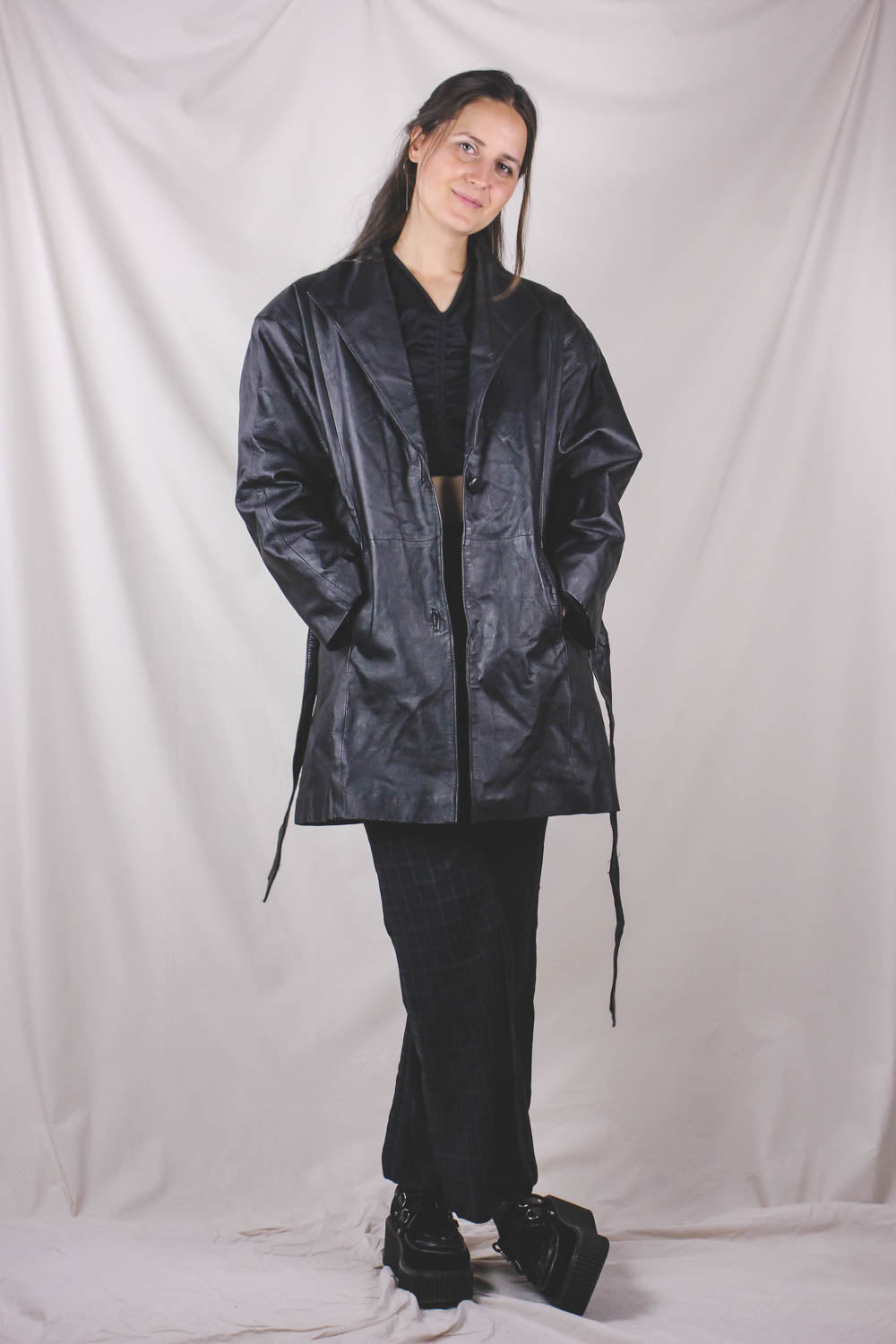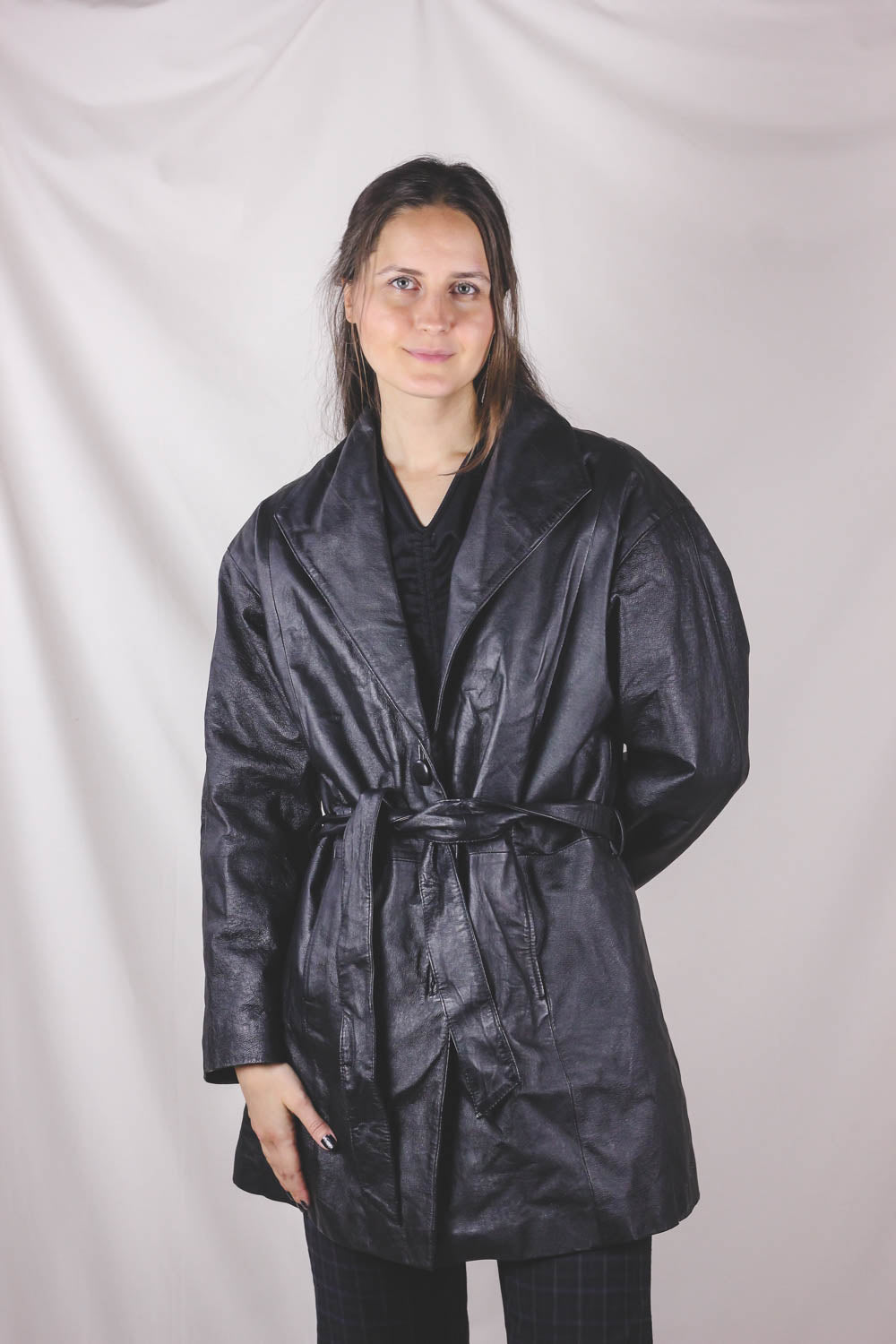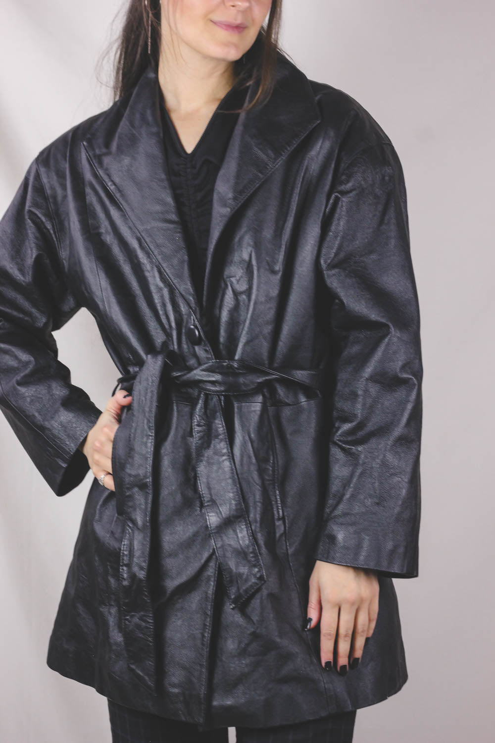 Ihana ajaton musta nahkatakki, jossa vyö. Olkatoppaukset. Kokomerkintä M.