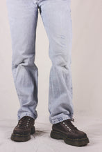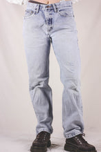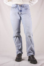 Wranglerin vaaleat mid waist farkut suoralla mallilla. Kokomerkintä W31 x L30. Farkuissa kulunut lookki, värjäymää lahkeissa sekä kulutettua pintaa.
