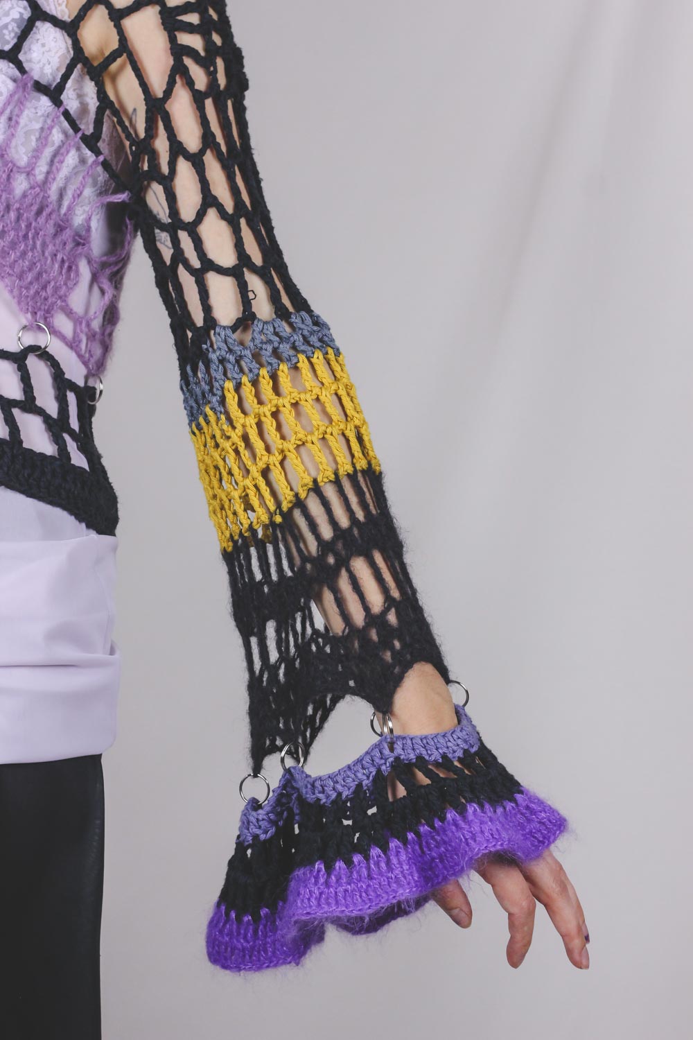 Aivan upea taiteilija Petra Kinnusen virkkaama paita, jonka teossa on hyödynnetty kierrätettyjä materiaaleja. Paidassa on metallisia rinkuloita sekä levenevät näyttävät hihat. Paidan materiaaleina ovat puuvilla ja mohair. Helppo kerrostaa monenlaisen asun kanssa! Rennon istuvuuden ansiosta sopii monelle.