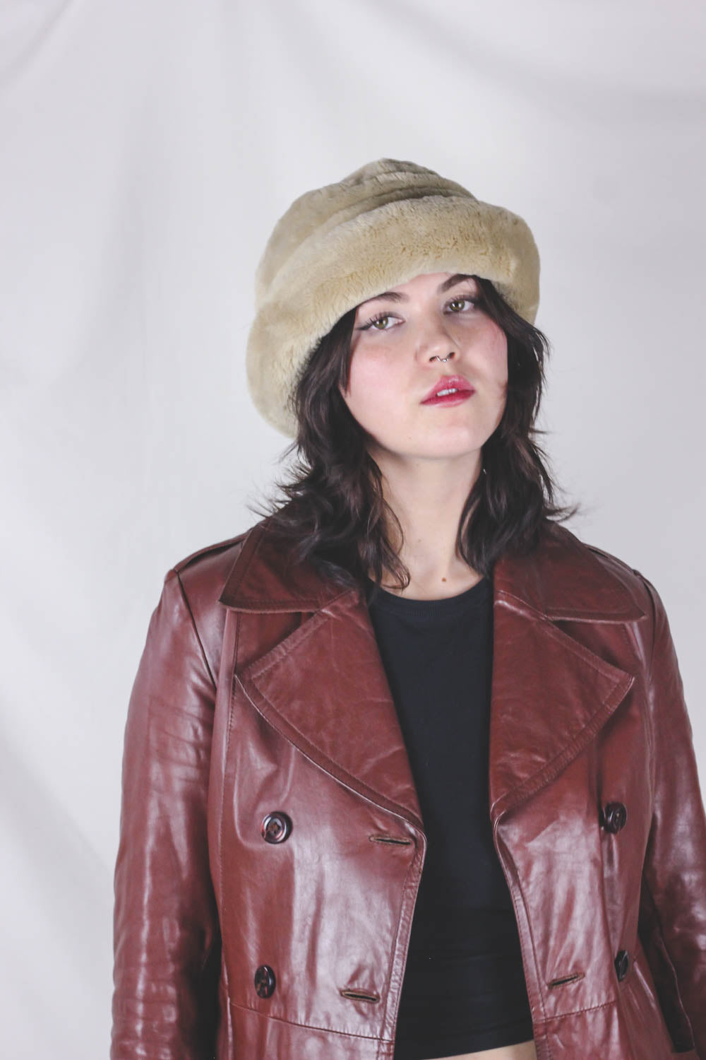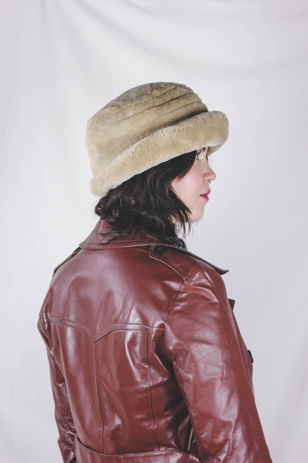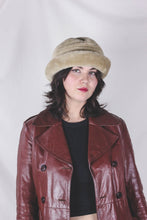 Super kaunis beige vintagepörröhattu! Kaunis ruusukultainen vuori. Joustaa hieman.