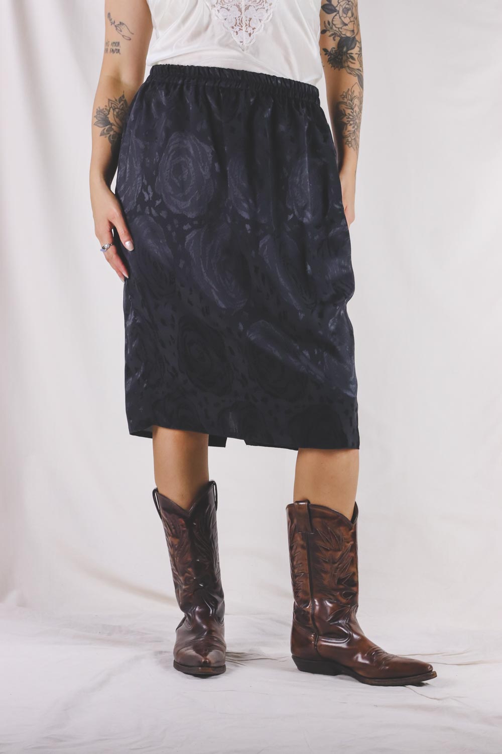 Kaunis musta vintagehame, jossa ruusukuviointi. Kuminauhavyötärö.