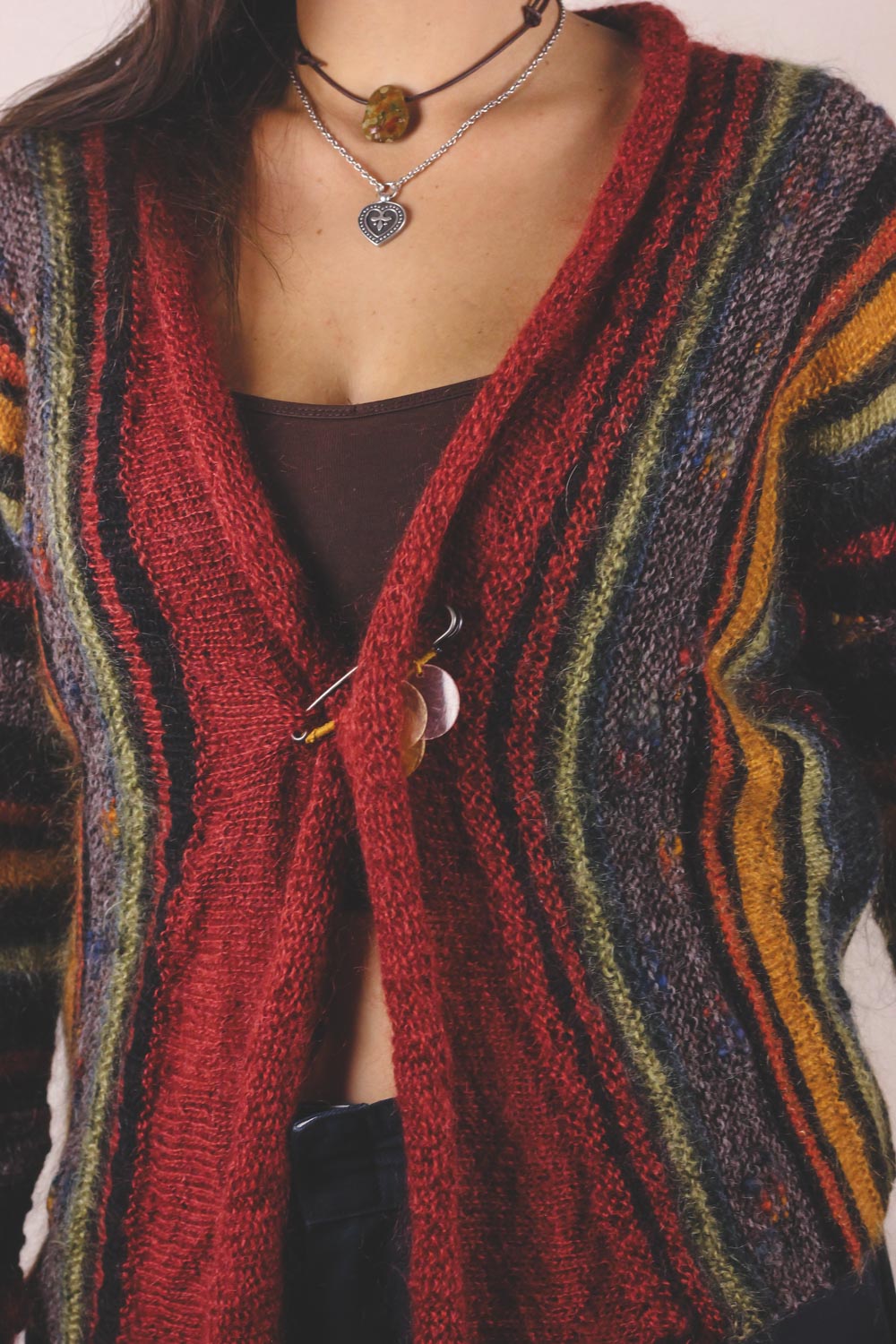 Super kaunis käsintehty raidallinen mohairneule! Suljetaan hakasella, jossa koristeita. Joustaa annetuista mitoista.