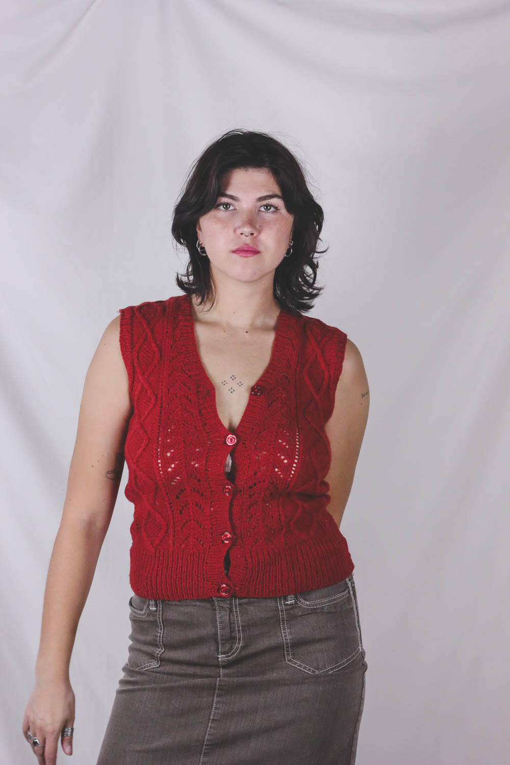Super kaunis tummanpunainen vintagevillaneuleliivi napeilla! Joustaa annetuista mitoista huomattavasti.