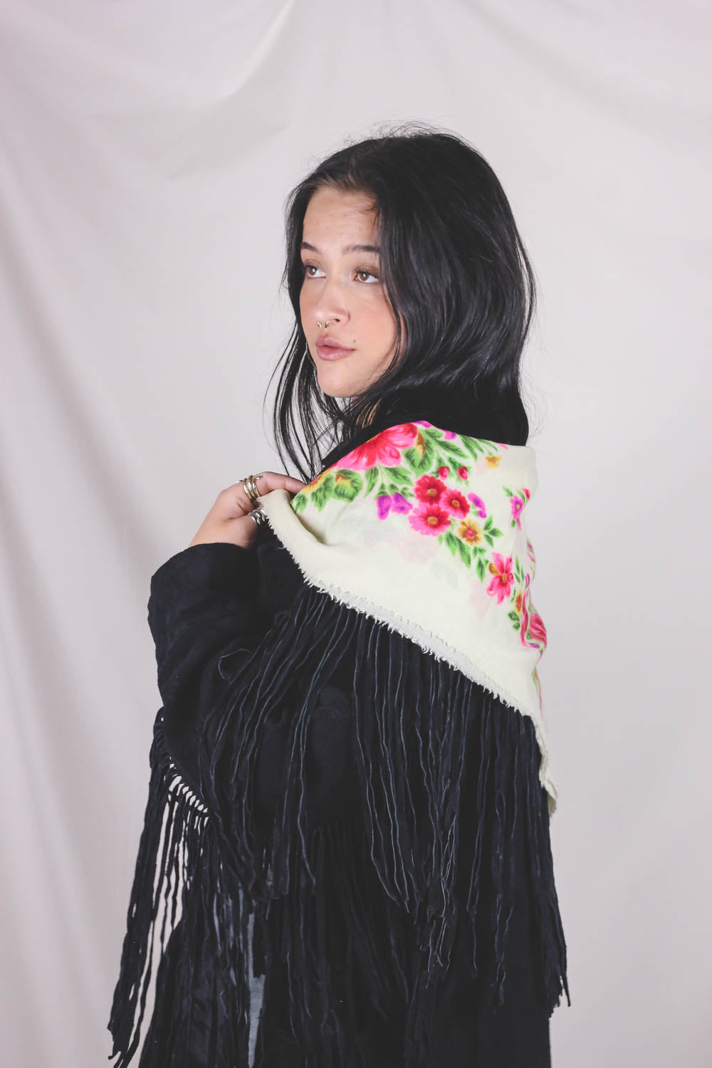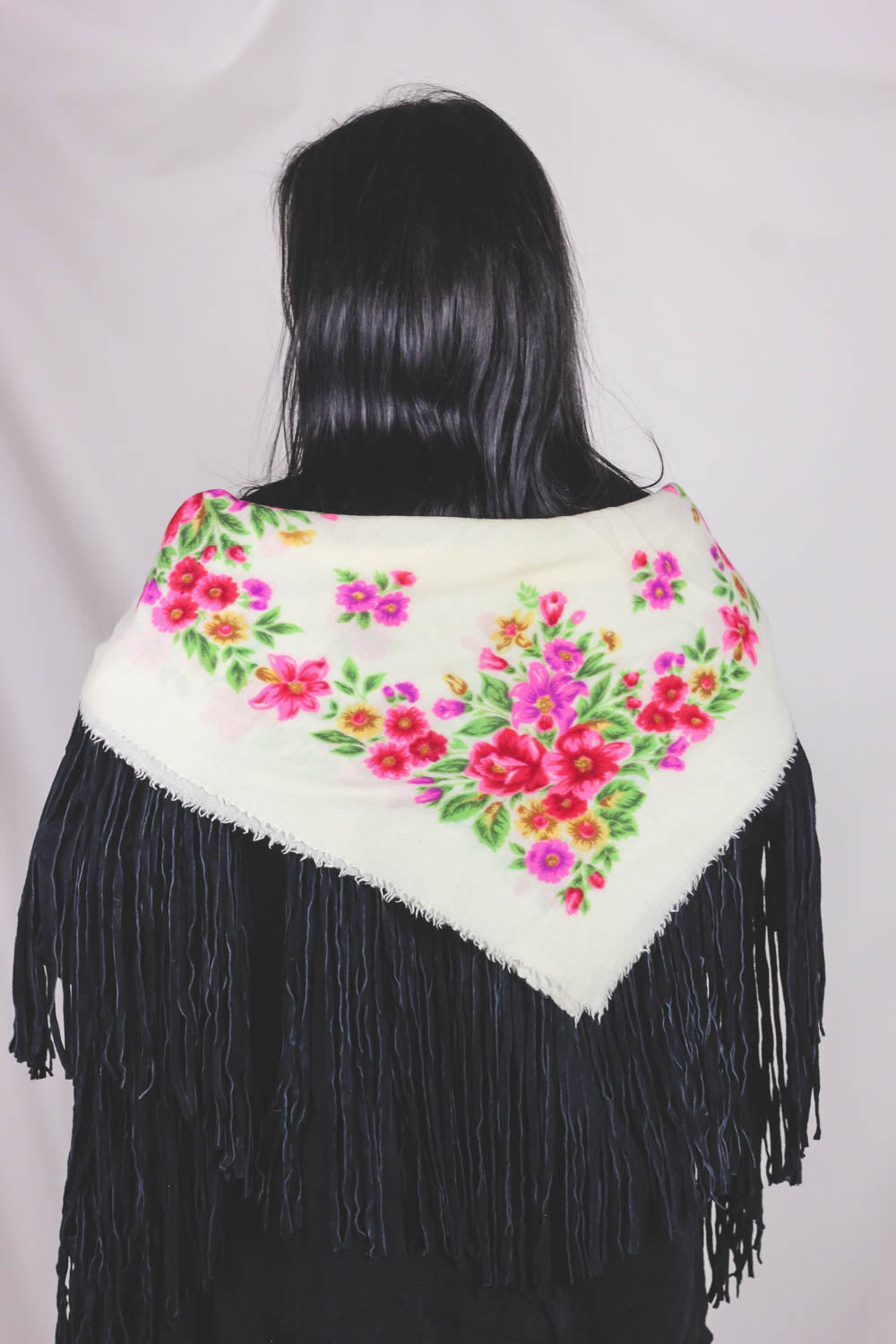 Ihana luonnonvalkea villahuivi pinkeillä ruusuilla.