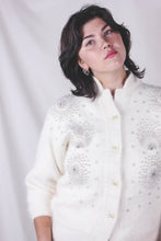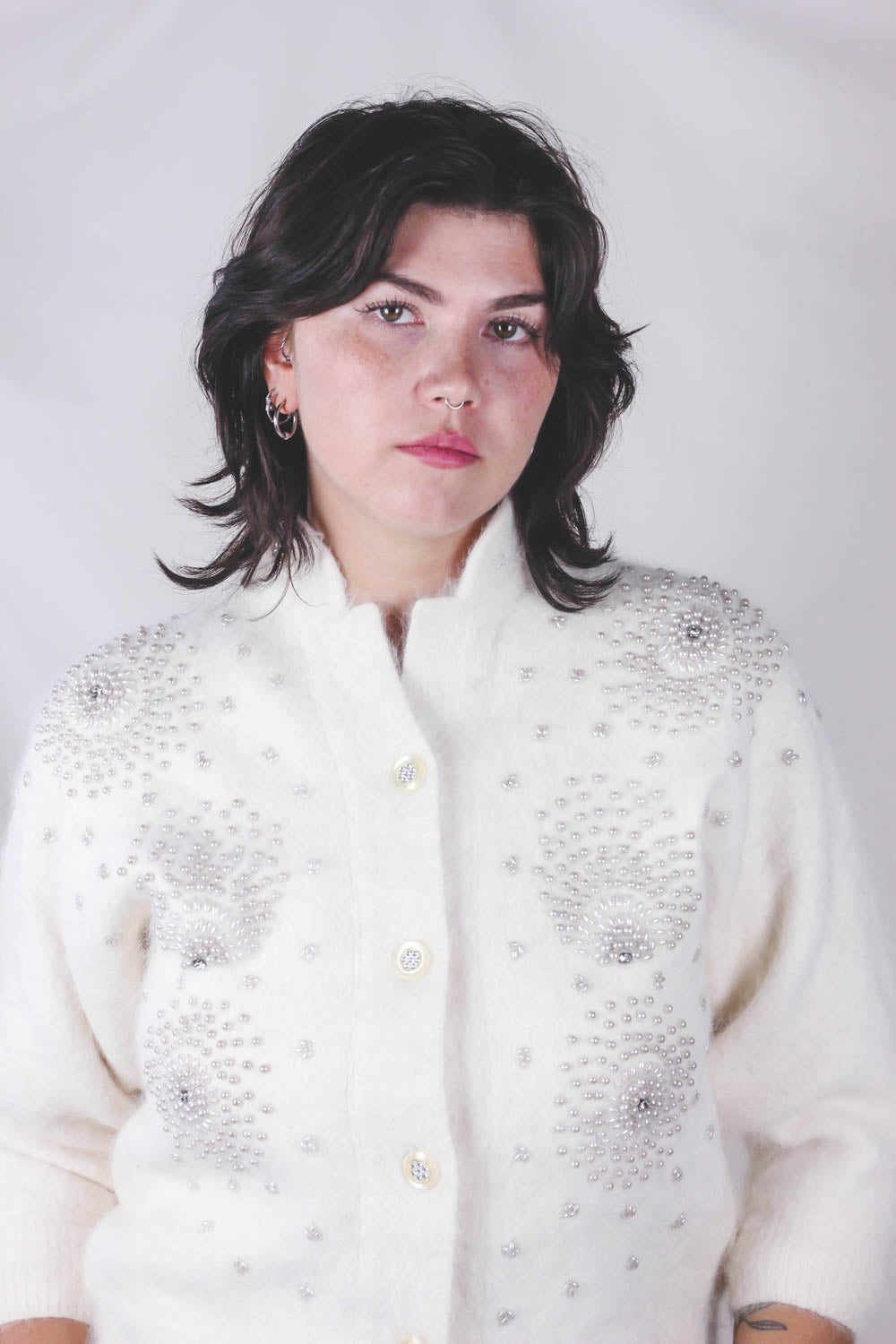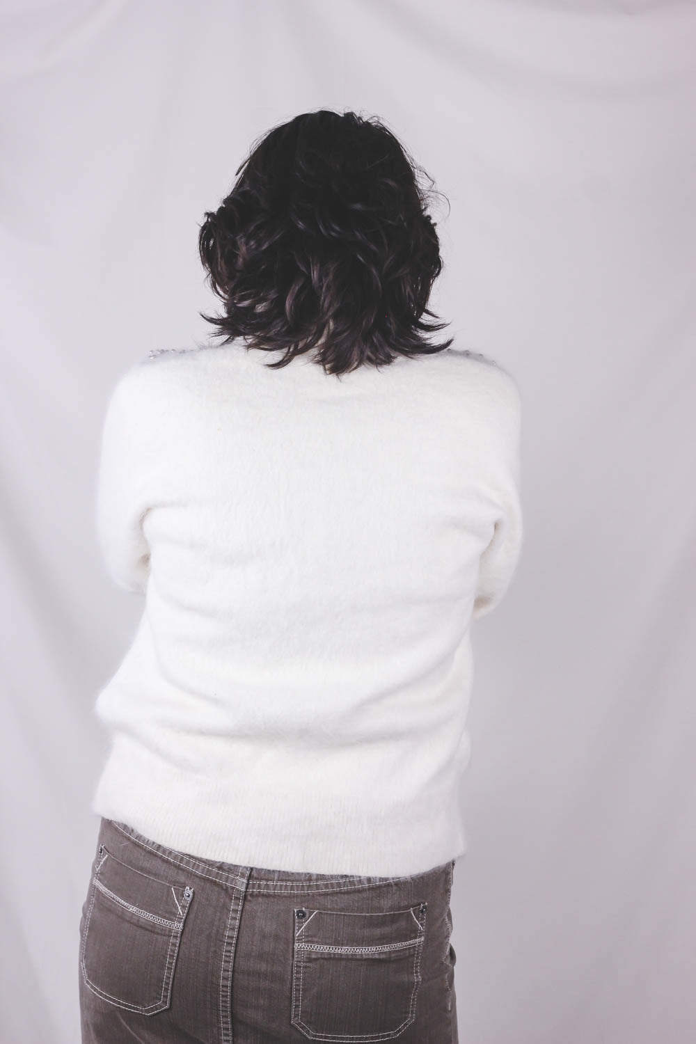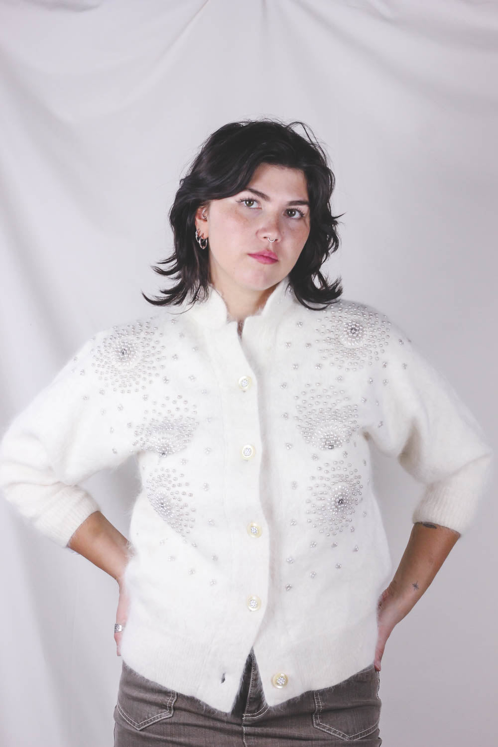 Super kaunis valkoinen helmikoristeltu angoraneule! Neule on todennäköisimmin kutistunut alkuperäisestä koosta ja saanut sen seurauksena 3/4-pituiset hihat. Neuleessa on vuori.